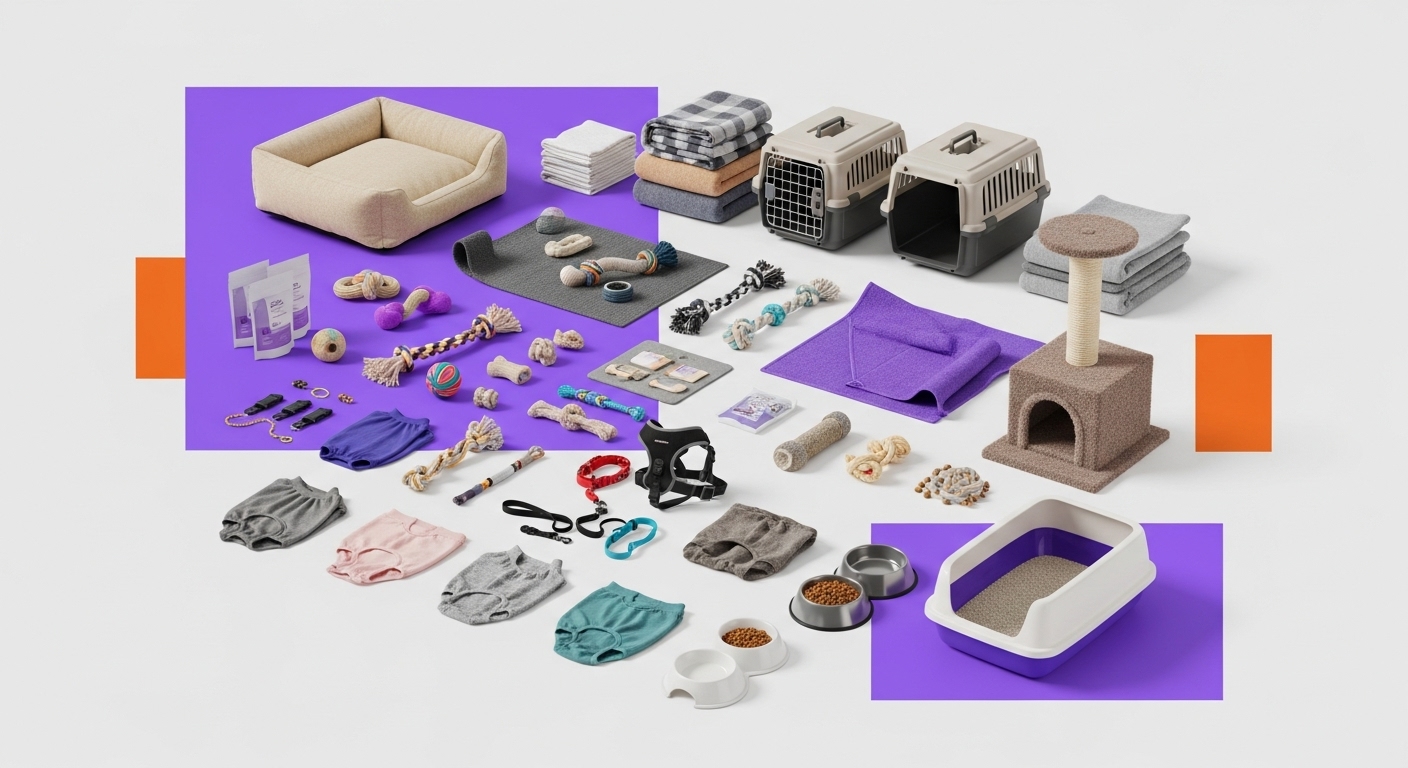 Caminhas, Bolsas de transporte, Mantinhas, Cobertinhas, Caixas de transporte, Brinquedos, Tapetes Higiênicos, Roupinhas, Peiteira, Guia, Coleiras, Enforcador, Arranhador, Saches, Pratinhos, Penicos, Caixas de areia.